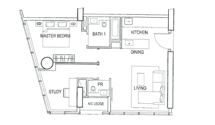 1 + study: 732 - 800 sqft